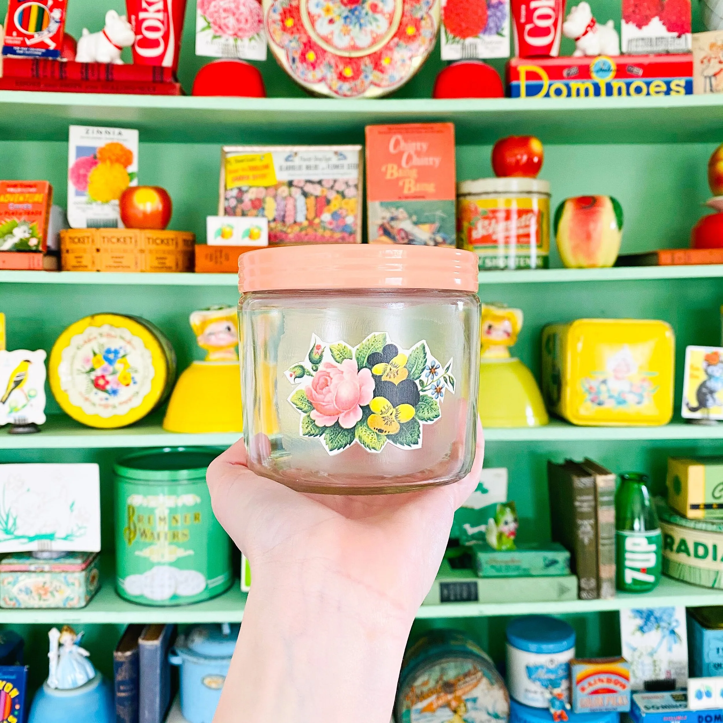 I love using Mod Podge to upcycle trash! The picture above is of a candle jar that was all used up. The backside of a vintage greeting card had a small colorful rose on it. I cut out the rose and mod podged it onto the jar. Now it’s a piece of decor!