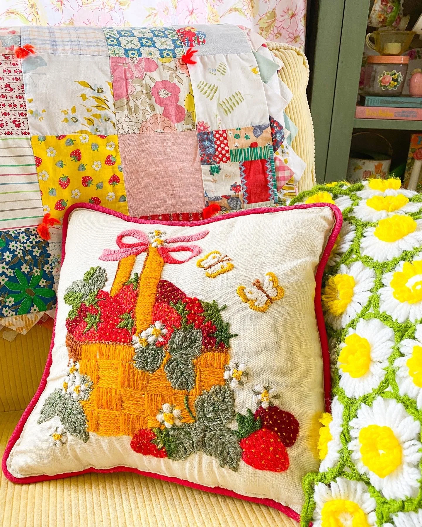 You can’t have a grandmacore home without fabric, quilts, and blankets everywhere. Cover your home with secondhand throws and pillows for the ultimate comfort vibe! Here are the best pieces to incorporate: